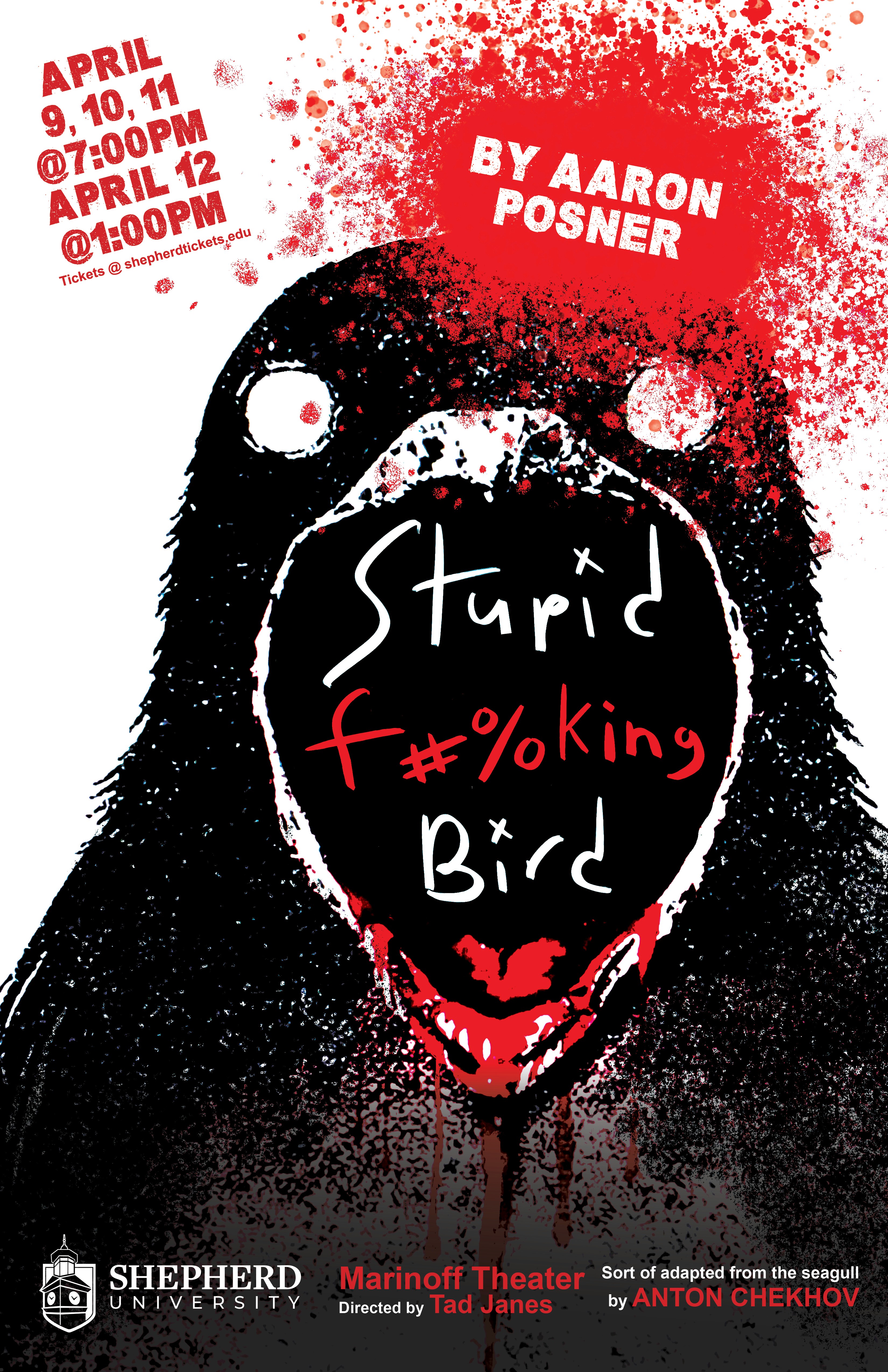This poster design was selected to promote Shepherd University’s production of Stupid F#%king Bird. I created a bold, high-contrast concept that matches the play’s raw, modern energy using aggressive type, stark imagery, and a limited red/black/white palette to deliver a dark, grimy piece for the tone of the play.